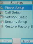 Settings - เมนูตั้งค่าโทรศัพท์ (Phone Setup) ตั้งค่าการโทร (Call Setup) เครือข่าย (Network Setup) การป้องกัน (Security Setup) และกลับไปตั้งค่าเดิม (Restore Factory Settings)