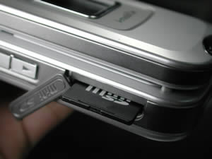 ด้านขวา - ปุ่มปรับระดับเสียง ถัดลงมาเป็นช่องเสียบการ์ดหน่วยความจำ miniSD พร้อมยางปิดกันฝุ่น