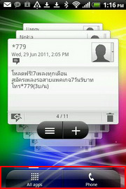 - ด้านล่างสุด มีแถบไอคอนสำหรับเปิดแอพฯ ทั้งหมด และโทรศัพท์ โดยจะแสดงในทุกๆ หน้าของหน้าจอหลักทั้ง 7 หน้า