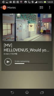 เครื่องเล่นวิดีโอ (ภาพยนตร์) รองรับคลิปวิดีโอนามสกุล .3GP, .MP4, .MKV, .AVI, .XVID, .MOV สามารถเปิดใช้คุณสมบัติ MOBILE BRAVIE® ENGINE 2 ซึ่งภาพวิดีโอจะมีสีสดยิ่งขึ้น