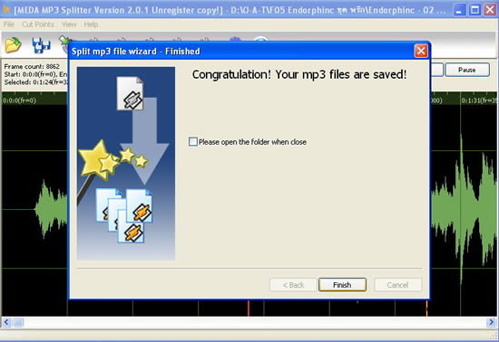 ฮั่นแน่ ! ตัดเสร็จแล้ว จะติ๊กเครื่องหมายถูกที่ช่อง Please open the folder when close หรือไม่ก็ตามใจครับ แล้วก็มากดที่ปุ่ม Finish เป็นอันเสร็จพิธี