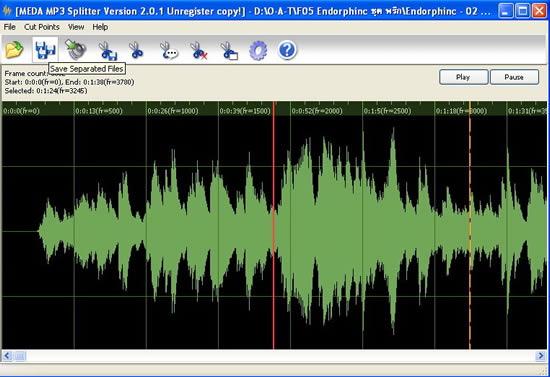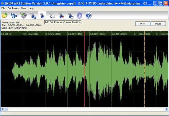 กดปุ่ม Play เพื่อเล่นเพลงไปจนถึงท่อนฮุคแรกที่ต้องการจะตัด แล้วให้กดปุ่ม Pause เพื่อพักการเล่นไว้ชั่วคราว (สังเกตดูว่าจะเห็นเส้นประสีเหลืองมาหยุดอยู่ ตรงนั้นคือบริเวณที่เราจะทำการ กำหนดจุดในการตัด)