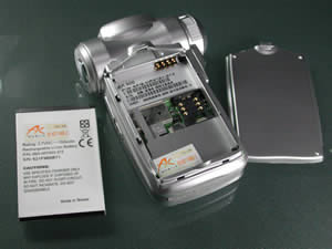 ด้านหลัง - ที่ตัวเครื่องจะเป็นฝาหลัง ซึ่งมีที่เลื่อนฝาหลังเป็นรอยนูน 4 ขีดที่กึ่งกลางด้านบน การเปิดฝาหลังใช้วิธีกดที่รอยนูน 4 ขีด และเลื่อนลง