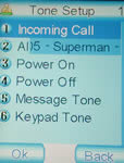 โดยในเมนู Phone Setup จะเป็นการตั้งค่า วัน เวลา ตั้งเวลาเปิดปิดเครื่อง ภาษา การแสดงผลหน้าจอ ความเข้มหน้าจอ ข้อความตอนรับ ปุ่มโทรด่วน เมนูลัดของปุ่มควบคุมทิศทาง และตั้งเปิด-ปิดการอัพเดตวัน เวลาแบบอัตโนมัติ Multimedia - เมนูเครื่องเล่นเพลง บันทึกเสียง และแต่งเพลง