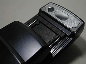ด้านหลัง - ดูเรียบ ๆ เมื่อเลื่อนฝาสไลด์ขึ้นจะเห็นเลนส์กล้องดิจิตอลอยู่ด้านมุมบนซ้าย + Mirror ถ่ายภาพตัวเองอยู่ข้างเลนส์กล้อง และ ปุ่มปลดล็อกแบตเตอรี่อยู่กึ่งกลางส่วนท้ายของเครื่อง