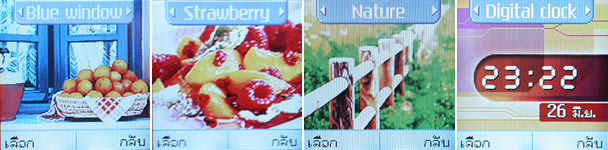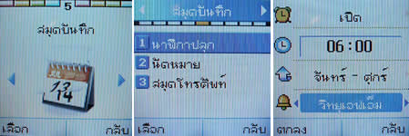 - การตั้งค่า : สามารถกำหนดรูปภาพพื้นหลัง (มีในเครื่อง 3 แบบ) พร้อมนาฬิกาแบบเข็มและแบบดิจิตอล, กำหนดข้อความทักทาย, กำหนดเมนูไทย-อังกฤษ, ตั้งปิดแสงไฟหน้าจอตั้งแต่ 10 จนถึง 60 วินาที, ปรับความเข้ม, เปลี่ยนธีมเมนูได้ 4 สี - สมุดบันทึก : นาฬิกาปลุกตั้งเตือน 5 เวลา โดยสามารถเลือกวันปลุกทั้งแบบ (ครั้งเดียว/จันทร์-ศุกร์/จันทร์-เสาร์/ทุกวัน) หรือจะกำหนดตั้งเตือนเปิดวิทยุ FM ก็ได้