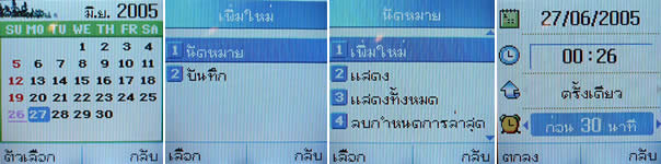 - นัดหมาย : แสดงปฎิทินแบบรายเดือน สามารถกำหนดหัวข้อได้ 2 แบบ (นัดหมาย/บันทึก) โดยในการเตือนนัดหมายแต่ละครั้ง สามารถกำหนดเตือนแบบ (ครั้งเดียว/ทุกวัน/ทุกสัปดาห์/ทุกเดือน/รายปี) และเลือกการเตือนล่วงหน้าได้ตั้งแต่ 10 นาที จนถึง 1 วันก่อนเวลานัด