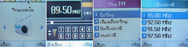 - วิทยุเอฟเอ็ม (FM Radio) : ระบบค้นหาสถานีอัตโนมัติ ระบบเสียงสเตอริโอ (Stereo) เพิ่ม-ลดเสียงได้ทันทีผ่านปุ่มควบคุมเมนู บันทึกสถานีสูงสุด 10 ช่อง ตั้งเตือนเปิดสถานี เปิดฟังวิทยุผ่านลำโพงได้ (Loudspeaker)