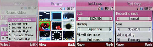 นอกจากนี้ยังเลือกถ่ายภาพเคลื่อนไหวพร้อมเสียงได้ 4 ขนาด โดยมีขนาดใหญ่สุดที่ 352x288 พิกเซล รองลงมา 320x 240, 176x 144 และ 128x 96 พิกเซล ตามลำดับ โดยขนาดที่เหมาะสมสำหรับใช้แนบไฟล์ส่งข้อความจะอยู่ที่ขนาด 176x144 พิกเซล เลือกคุณภาพได้ 4 ระดับ และหากอยู่ในสภาวะที่แสงไม่พอเพียงเลือกเปิด-ปิด แฟลชอย่างรวดเร็วด้วยปุ่มเลข 0 บันทึกไฟล์วีดีโอด้วยนามสกุล *.mp4 ซึ่งทั้งภาพนิ่งและภาพเคลื่อนไหวสามารถซูมภาพแบบดิจิตอลได้ 5 ระดับ พร้อมกับไฟแฟลชส่องสว่างในที่มืด