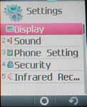 Settings สำหรับตั้งค่าการใช้งานต่างๆ ภายในตัวเครื่องอย่างหน้าจอ เสียงเรียกเข้า เสียงปุ่มกด เสียงสไลด์ตัวเครื่อง เสียงเปิด/ปิดเครื่อง ภาษา ระบบป้องกันการใช้งาน และเปิด IrDA เพื่อรับข้อมูลจากภายนอก