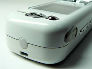 ด้านขวาของเครื่อง - ส่วนบนสุดจะเป็นช่องเสียบชุดหูฟังมีที่ปิดกันฝุ่น ถัดลงมาเป็นปุ่มปรับระดับเสียง และปุ่มชัตเตอร์สำหรับถ่ายภาพ