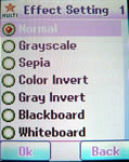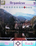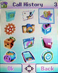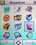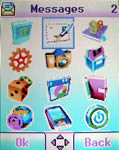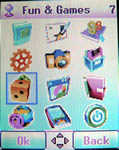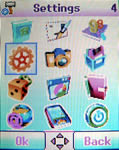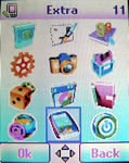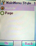 เมนูหลักแสดงผลเป็นไอคอนเคลื่อนไหวได้ วางเรียงแบบตาราง (Matrix) 4 แถว 3 คอลัมน์ หรือเปลี่ยนการแสดงผลของเมนูเป็นรูปแบบ Page ได้ที่เมนู Settings > Phone Setup > Display Characteristic > MainMenu Style