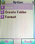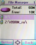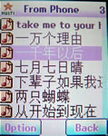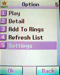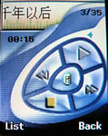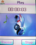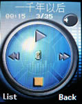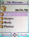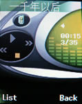 เครื่องเล่นเพลง (Audio Player) ในขณะสแตนด์บายสามารถเปิดเครื่องเล่นเพลงขึ้นมาได้ทันทีด้วยปุ่ม MP3 (ด้านซ้ายของเครื่อง) ในโหมดเครื่องเล่นเพลงสามารถกดดูรายชื่อเพลงด้วยปุ่มซอฟต์คีย์ซ้าย และกดอีกเพื่อเปิดเมนู Option เพื่อเล่นเพลงที่เลือก ดูรายละเอียด ตั้งค่าเพลงที่เลือกเป็นเสียงเรียกเข้า รีเฟรสรายการเพลง และตั้งค่าเครื่องเล่นเพลงได้ดังนี้