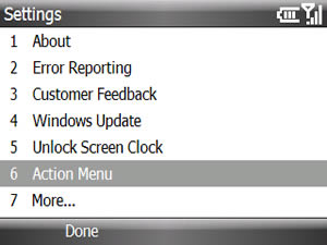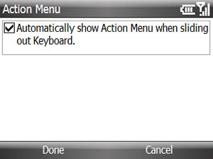 การแสดงผลเป็นแนว จะปรับมุมมองโดยอัตโนมัติทันทีเมื่อเลื่อนแผงแป้นพิมพ์ QWERTY ออกมาใช้งาน พร้อมกลับเปิดเมนู Action ขึ้นมา ให้เข้าถึงการใช้งานข้อความ MMS/SMS , Email และ Messenger สามารถออกจากเมนู Action เพื่อกลับสู่หน้าจอหลักได้ หากต้องการเอา เมนู Action ออก ให้เข้าไปที่ Start เข้าไปที่ Settings เลือกรายการ More... ไปเรื่อยๆ จนกว่าจะเจอ Action Menu แล้วเอาเครื่องหมายถูก ในกล่องสี่เหลี่ยมออก จากนั้นกด Done