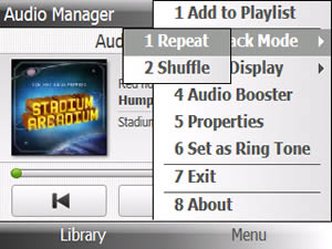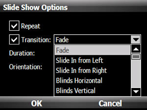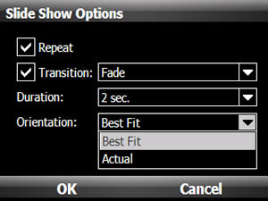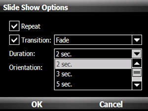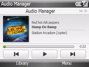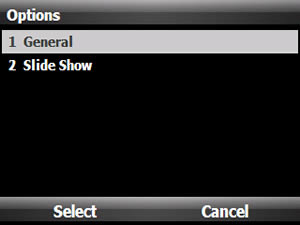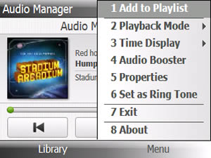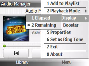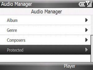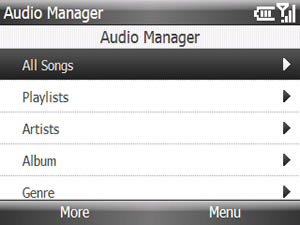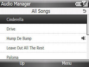 นอกจากการเลื่อนดูรูปภาพด้วยตัวเองแล้ว ยังสามารถปล่อยให้รูปภาพไหลไปเองโดยอัตโนมัติ ด้วยการใช้งานฟังกืชั่น Slide Show ผู้ใช้สามารถเข้าไปตั้งค่าเอฟเฟ็คระหว่างเปลี่ยนภาพได้หลายแบบ และกำหนดช่วงเวลาแสดงภาพได้ตั้งแต่ 2 ถึง 10 วินาที Audio Manager โปรแกรมเครื่องเล่นเพลง เมื่อเข้าสู่โปรแกรมครั้งแรกจะพบกับรายการค้นหาเพลงในรูปแบบต่างๆ คือ ค้นหาเพลงทั้งหมด, ค้นหารายการเพลง, ค้นหาตามรายชื่อศิลปิน, ค้นหาอัลบั้ม, ค้นหาตามประเภทของเพลง และ ค้นหาตามชื่อผู้แต่ง หรือเข้าสู่เครื่องเล่นได้ที่ที โดยการกดปุ่ม Player หรือ กดปุ่มซอฟต์คีย์ขวา