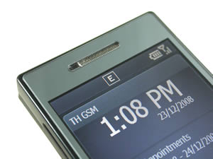ด้านหน้า - แผงหน้าปัดด้านหน้า เคลือบผิวด้วยวัสดุสะท้อนเงา มี Light sensor ติดตั้งอยู่คู่กับลำโพงสนทนา ส่วนของกรอบจอแสดงผลวางราบ ในระดับเดียวกับตัวเครื่อง ถัดลงมาเป็นแผงปุ่มควบคุม และ แผงปุ่มกดตัวเลข