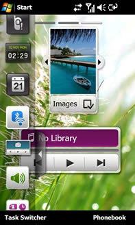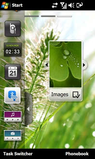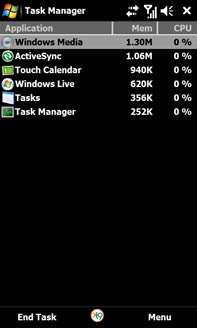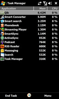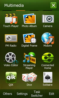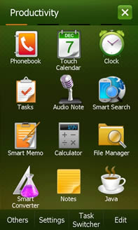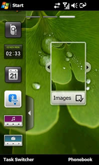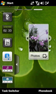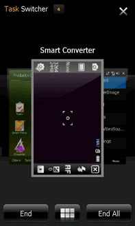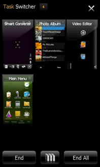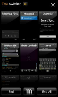 การแสดงเมนูหลักด้วย TouchWiz UI มีความสะดวกกว่าการแสดงผลแบบเดิมของ Windows Mobile ที่แสดงรายชื่อโปรแกรมทั้งหมด ในหน้าเดียว แต่สำหรับเมนูหลักของ TouchWiz สามารถแบ่งได้ถึง 10 หน้า แต่ละหน้ากำหนดโปรแกรมที่อยู่ในกลุ่มเดียวกันได้อย่างอิสระ ง่ายต่อการค้นหา แต่ถ้าผู้ใช้ชอบความคุ้นเคยกับการแสดงผลในรูปแบบ Windows Mobile สามารถปิดการใช้งาน Samsung TouchWiz UI ได้โดยเข้าไปที่ Settings เลือกเมนู General Settings เลื่อนลงไปล่างสุดเพื่อเลือก Samsung TouchWiz UI แตะที่จุดวงกลมสีเขียว ให้กลายเป็นสีเทา แล้วแตะที่ Done ย้อนกลับออกมาที่หน้าจอหลัก เมื่อกลับเข้าไปที่เมนู Start จะเข้าสู่การแสดงผลแบบเดิมของ Windows Mobile แต่ก็ยังเข้าสู่เมนูรูปแบบ TouchWiz ได้อย่างง่ายๆ เพียงกดปุ่มเมนู (ปุ่มรูปกล่องสามมิติ ระหว่างปุ่มโทรออกกับวางสาย) Task Switcher ฟังก์ชั่นเปิดดูการทำงานโปรแกรม หรือแอพพลิเคชั่นต่างๆ ที่ผู้ใช้เปิดทิ้งไว้ แต่ออกมาโดยไม่ได้ปิด โดยที่หน้าจอหลักจะมี Task Switcher แสดงไว้ตรงมุมล่างซ้าย เมื่อเปิดเข้าไปจะแสดงโปรแกรมที่เปิดค้างไว้ด้วยรูปภาพขนาดย่อ หรือปรับเปลี่ยนให้มีขนาดใหญ่ได้ นอกจากนี้ ยังสามารถปิดโปรแกรมต่างๆ โดยการกดปุ่ม End หรือ ปิดโปรแกรมที่เปิดค้างไว้ทั้งหมดด้วย End All