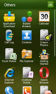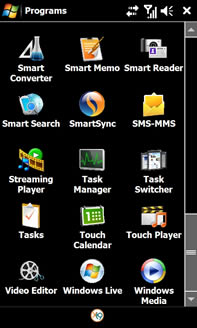 การเปิดเมนู Start เพื่อดูรายชื่อโปรแกรมทั้งหมด ในรูปแบบเดิมของระบบปฏิบัติการ Window Mobile ได้ถูกซ่อนไว้ โดยใช้เมนูหลักของ TouchWiz เข้ามาแทนที่ สามารถเปิดเมนูหลักด้วยการกดปุ่มเมนูรูปทรงกล่องสามมิติ (ปุ่มตรงกลางระหว่างปุ่มโทรออกกับปุ่มรับสาย)