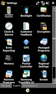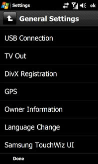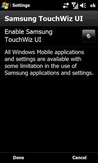 หากต้องการปิดการแสดงผลของเมนู TouchWiz เพื่อกลับมาใช้งานรูปแบบเมนูดั้งเดิมของ Window Mobile ให้เปิดเมนูหลักขึ้นมา แตะที่ Settings (ปุ่มที่สองในแถบเมนูด้านล่าง ถัดจากปุ่ม Others) เข้าไปที่รายการ General Settings เลื่อนลงไปเลือก Samsung TouchWiz UI แตะที่จุดสีเขียว ให้กลายเป็นจุดสีเทา จากนั้นแตะ Done ที่มุมล่างซ้าย