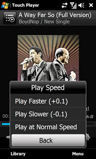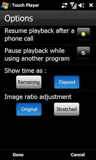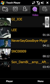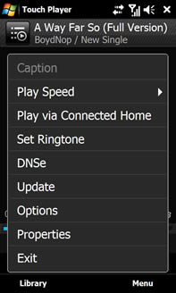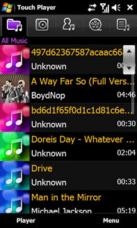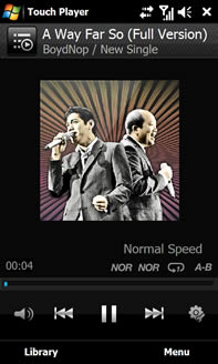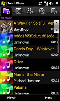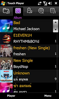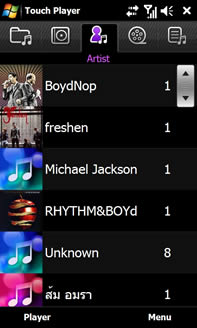 Touch Player โปรแกรมเครื่องเล่นเพลง และวีดีโอ เมื่อเข้าสู่โปรแกรมครั้งแรก ระบบจะทำการสแกนค้นหาไฟล์ฺเพลง และวีดีโอ ให้อัตโนมัติ ดังนั้น เมื่อมีการเพิ่งเพลงหรือวีดีโอเข้าไปใหม่ จะต้องทำการอัพเดตไฟล์ทุกครั้ง หลังจากอัพเดตไฟล์แล้ว ให้แตะที่ Done มุมล่างขวา จะเข้าสู่ Library หรือแหล่งเก็บไฟล์ทั้งหมด โดยจะแสดงรูปภาพหน้าปกอัลบั้ม (ถ้ามี) หากเป้นไฟล์วีดีโอก็จะแสดงรูปภาพขนาดย่อด้วย ส่วนการค้นหาไฟล์ จะแยกออกเป็น 5 หมวดหมู่ดังนี้ All Music เพลงทั้งหมด, Album อัลบั้มเพลง, Artist ศิลปิน, Video วีดีโอทั้งหมด และ Playlist รายการที่สร้า่ง