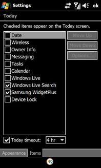 ผู้ใช้สามารถปิดการแสดง Samsung WidgetPlus ได้โดยการเข้าไปที่ฟังก์ชั่น Settings > Display and Light > Items on Today เปิด Menu (ที่มุมล่างขวา) แล้วเข้าไปที่ Edit จากนั้นแตะเครื่องหมายถูกบนกล่องหน้า Samsung WidgetPlus (ให้เครื่องหมายถูกหายไป) และกด Done เมื่อย้อนกลับมาที่หน้าจอหลัก จะพบว่าแถบวิดเจ็ตได้หายไป แล้วหน้าจอก็จะแสดงผลเพียงหน้าจอเดียว สำหรับฟังก์ชั่นใน Items on Today จะมีให้เลือกใช้งานทั้งหมด 10 ฟังก์ชั่น เมื่อเลือกแล้วจะมาแสดงฟังก์ชั่นนั้นบนหน้าจอหลัก ซึ่งเป็นแบบฉบับของระบบปฏิบัติการ Windows Mobile แต่ถ้าเลือกใช้ Samsung WidgetPlus จะไม่สามารถใช้งานไอเท็มอื่นๆ ได้ Samsung TouchWiz UI การแสดงผลแบบเดิมของ Windows Mobile ถูกแทนที่ด้วยการแสดงผลรูปแบบ TouchWiz คือการแสดงเมนูต่างๆ ด้วยรูปภาพไอคอน วางเรียงในแบบตาราง โดยถูกกำหนดเป็นค่าเริ่มต้น ดังนั้นเมื่อผู้ใช้งานเปิดเมนู Start จะเข้าสู่การแสดงเมนูแบบ TouchWiz ทันที แต่ไอคอนต่างๆ ยังคงเป็นโปรแกรมหรือแอพพลิเคชั่นมาตรฐานที่มากับระบบปฏิบัติการ Windows Mobile พร้อมกับโปรแกรมเสริมที่มากับ Samsung i8000 Omnia 2 โดยถูกแบ่งออกเป็น 4 หน้า (Main Menu) ตามลักษณะการใช้งาน ดังนี้