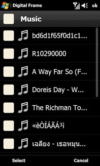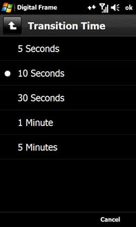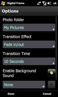 Digital Frame โปรแกรมกรอบรูปภาพดิจิตอล สำหรับแสดงรูปภาพ พร้อมเพลงประกอบ ใช้งานในแนวนอนเท่านั้น เมื่อเข้าสู่โปรแกรม จะแสดงรูปภาพทันที พร้อมนาฬิาบอกเวลาในรูปแบบดิจิตอลกับวันที่ วางทับบนรูปภาพ ด้านล่างจะแสดงแถบเครื่องมือต่างๆ ปุ่มแรกใช้ปรับขนาดรูปภาพ, ตามด้วยปุ่มควบคุมการแสดงภาพ (ย้อนกลับ/เล่นหรือหยุด/ถัดไป), ปุ่มปรับเปลี่ยนการแสดงผลนาฬิกากับวันที่, ปุ่มเข้าสู่การตั้งค่า และ ปุ่มปิดโปรแกรม ในส่วนของการตั้งค่าจะแสดงผลในแนวตั้ง สามารถเลือกโฟลเดอร์ที่จัดเก็บรูปภาพ, เลือกเอฟเฟ็คระหว่างเปลี่ยนรูปภาพ, กำหนดระยะเวลาแสดงรูปภาพของแต่ละรูปภาพ, เปิด/ปิดการใช้งานเพลงประกอบหรือเสียงเพลงพื้นหลัง และ เปิด/ปิดการแสดงสัญลักษณ์ ระบบสัญญาณโทรศัพท์, โปรไฟล์, พลังงานแบตเตอรี่ (แสดงอยู่มุมบนขวาเมื่อเริ่มเปิดใช้งานกรอบรูปภาพดิจิตอล)