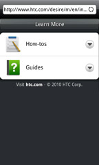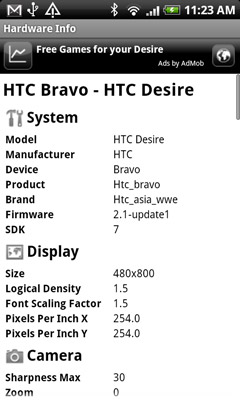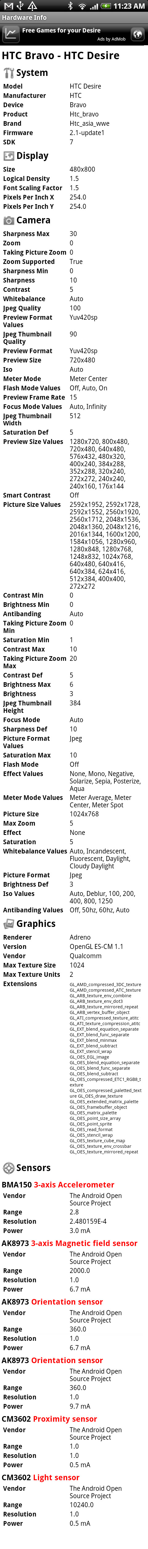 HTC Desire แอนดรอยด์โฟน Eclair 2.1 พร้อมด้วย Google Mobile Service อัพเดทข่าวสารผ่าน Friend Stream เปิดรับประสบการณ์ผ่านหน้าจอสัมผัส Capacitive ขนาด 3.6 นิ้ว หลอดภาพ AMOLED ระบบพลิกเอียงหน้าจออัตโนมัติ พลิกเครื่องเพื่อปิดเสียง ตั้งเครื่องเพื่อเบาเสียง ฟังเพลงผ่านช่องเสียบชุดหูฟัง ขนาด 3.5 มม. ถ่ายภาพด้วยกล้องขนาด 5 ล้านพิกเซล ระบุตำแหน่งของผู้ใช้ผ่าน GPS และ A-GPS พร้อมไฟแฟลชแบบ LED ส่งไฟล์ผ่าน Bluetooth และ microUSB ช่องเสียบ microSD รองรับได้สูงสุด 32GB เชื่อมต่ออินเตอร์เน็ตผ่าน Wi-Fi, HSPA, EDGE และ GPRS ...