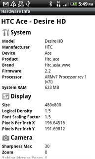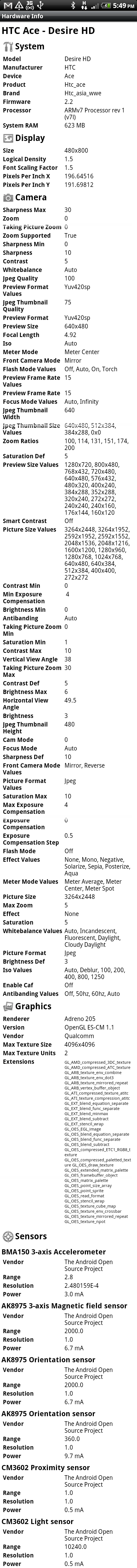 HTC Desire HD ทำงานด้วยหน่วยประมวลผลกลาง ARMv7 Processor rev 1 (v7I) ความเร็วสูงสุดที่ 1024.0MHz หน่วยประมวลผลภาพ Adreno 205 หน้าจอแสดงผลความละเอียด กว้าง 480 พิกเซล สูง 800 พิกเซล แสดงผลที่ความถี่ 60Hz เซ็นเซอร์ตรวจจับ 5 ตัว Accelerometer วัดทิศทาง, Magnatic วัดคลื่นแมเหล็ก, Orientation วัดความลาดเอียง, Proximity ชิดใบหน้ากับจอ และ Light วัดความสว่าง