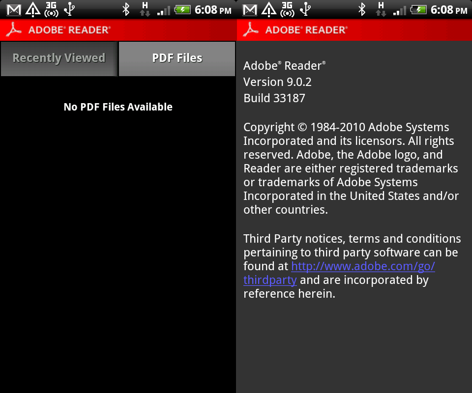 Adobe Reader เปิดอ่านไฟล์ PDF โดยโปรแกรมจะทำหน้าที่ค้นหาและแสดงรายชื่อไฟล์ PDF ที่มีใน microSD ให้ผู้ใช้งานได้เลือกเปิดอ่าน