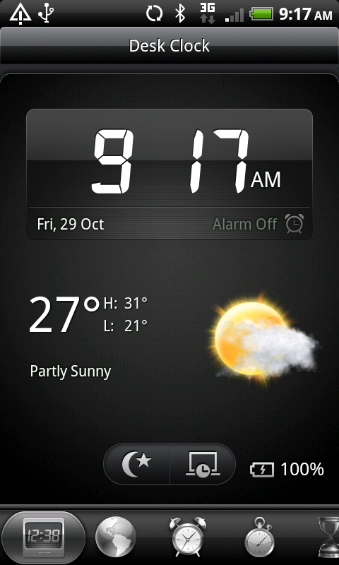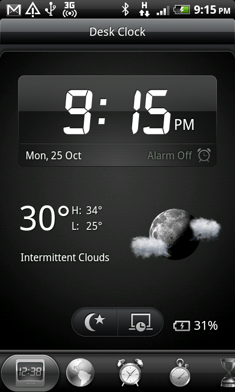 นาฬิกาแสดงเวลาและพยากรณ์อากาศ ด้านล้างมีปุ่มทางลัดเข้าสู่โหมดนาฬิกาตั้งโต๊ะ และ แสดงสถานะแบตเตอรี่