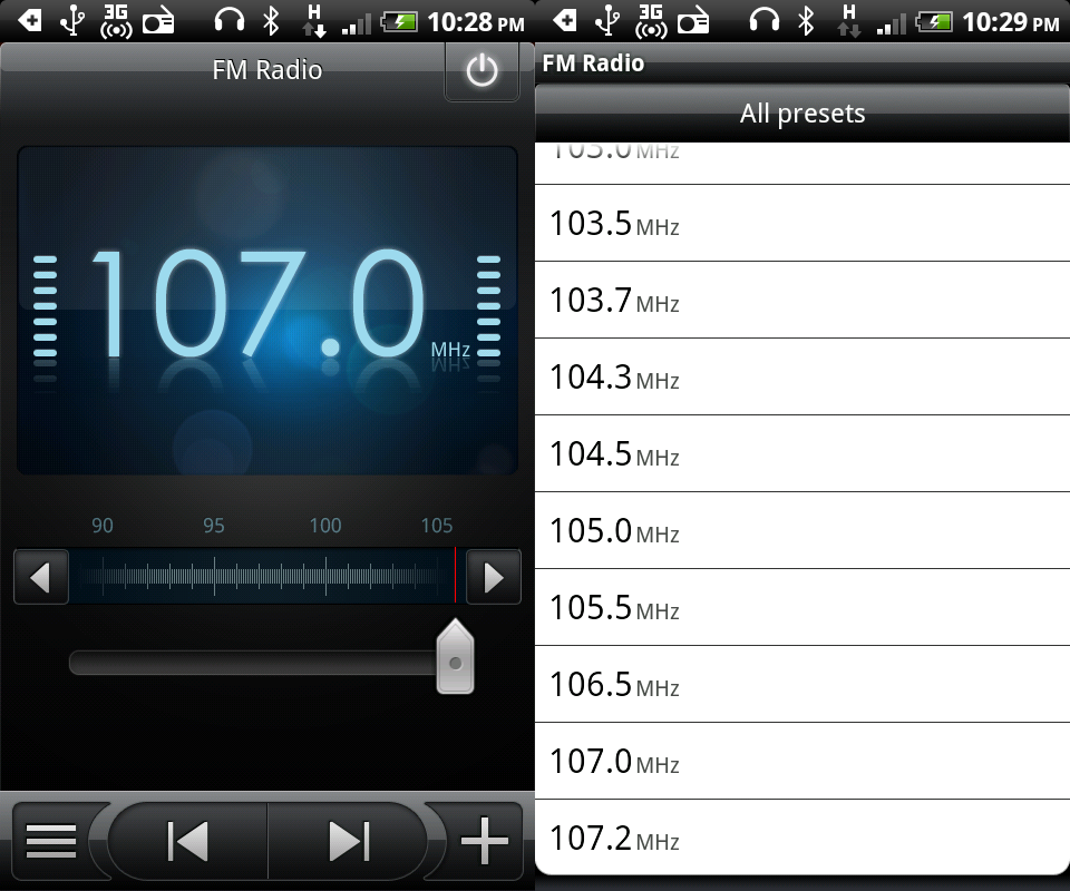 หน้าจอหลัก และ หน้าจอสำหรับเลือกสถานีต่าง ๆ ที่ตัวเครื่องรับคลื่นได้