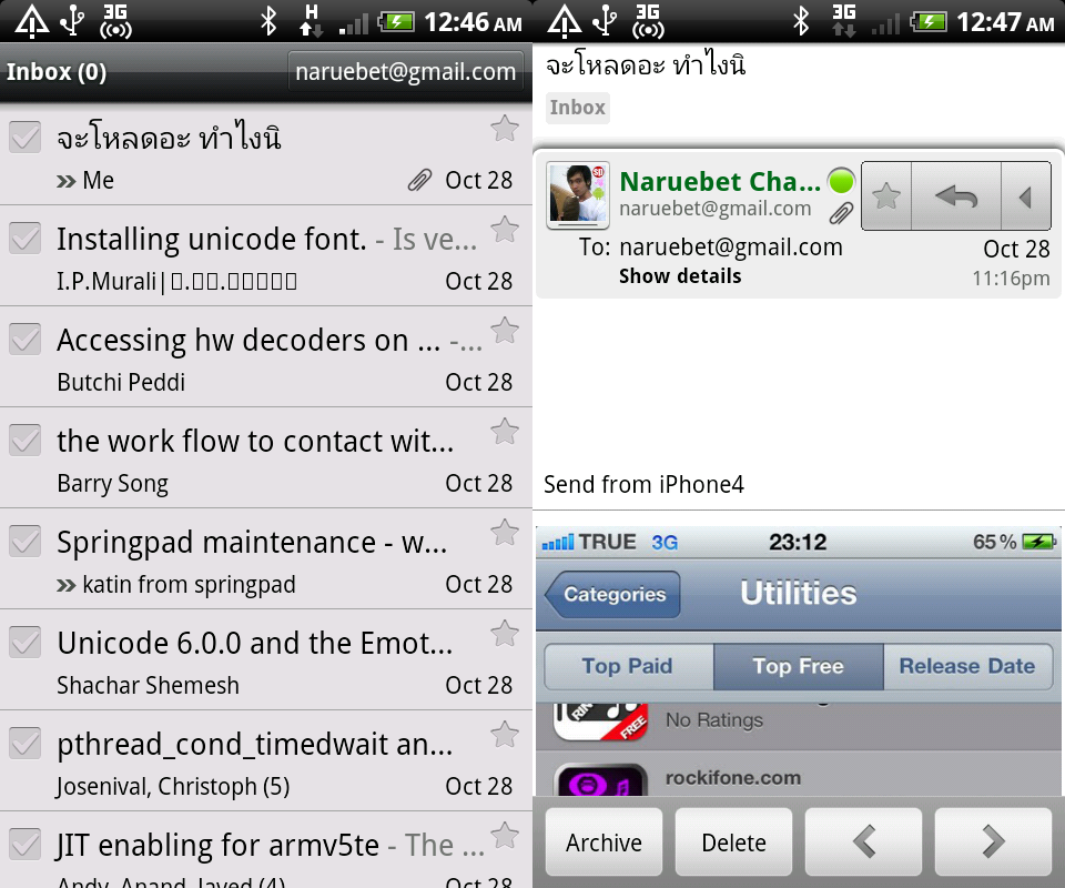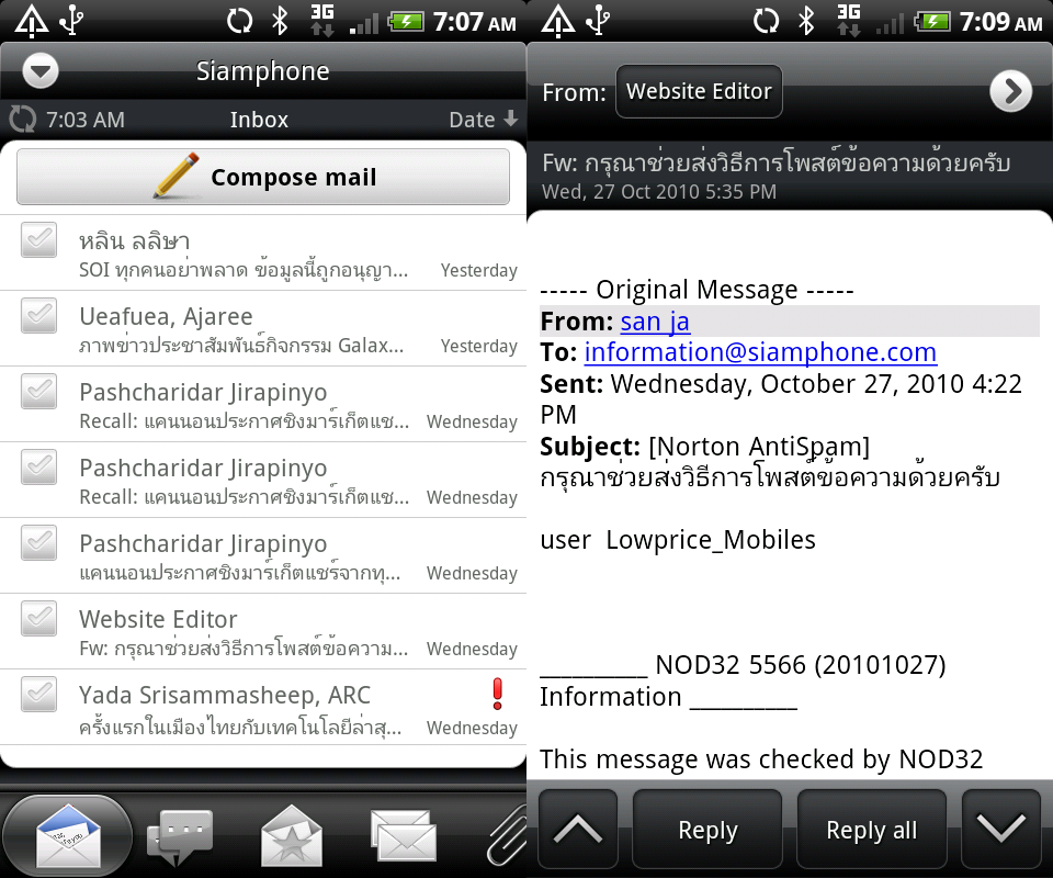 ภาพแสดงหน้ารายการอีเมลล์ และ หน้าอ่านอีเมลล์ที่มีการแทรกภาพในข้อความ