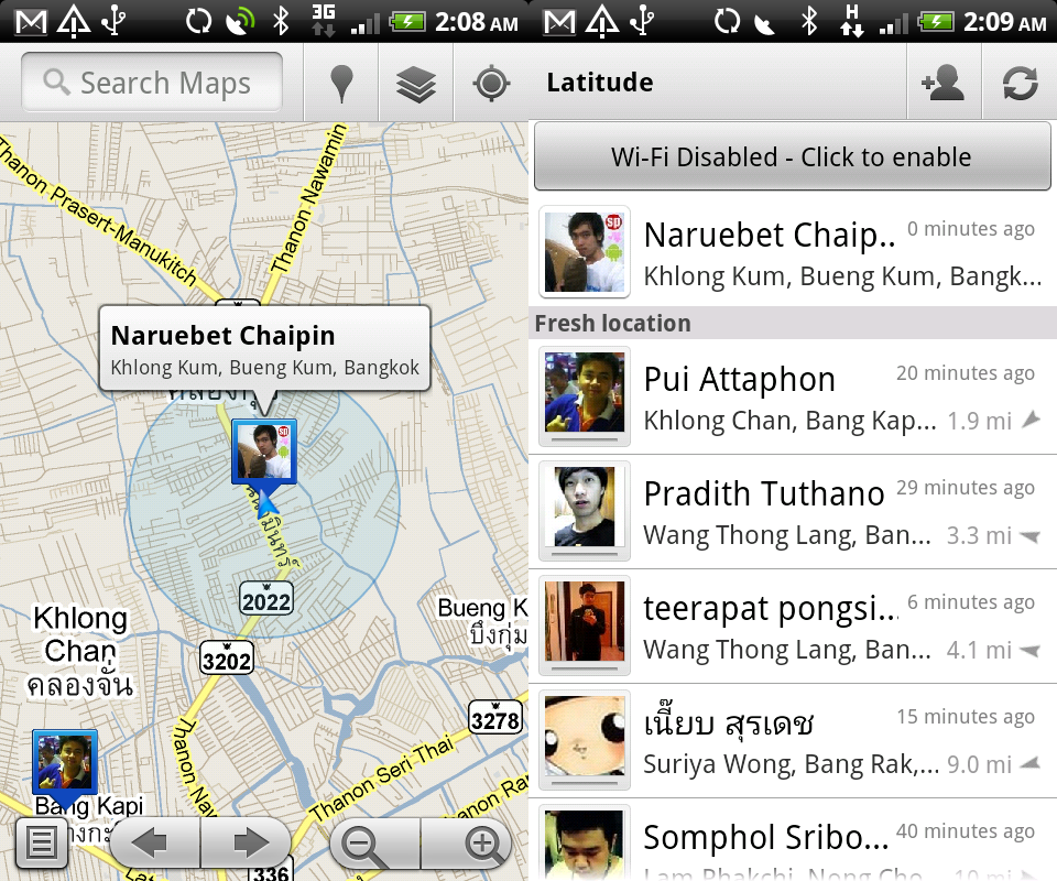 แสดงตำแหน่งของเพื่อนบนแผนที่ และ รายชื่อเพื่อน เวลาที่อัพเดทข้อมูลล่าสุด และ ระยะห่างพร้อมทิศทางจากจุดที่เราอยู่