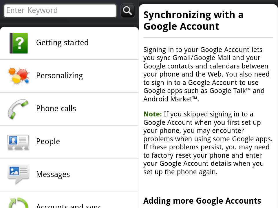 - Account & sync - บริหารบัญชีต่าง ๆ ที่เชื่อมต่อกับระบบแอนดรอยด์ในเครื่อง ผู้ใช้สามารถเลือกให้การซิงค์รันเป็นพื้นหลังได้ เลือกให้มีการซิงค์อัตโนมัติได้ รวมทั้งสามารถเพิ่มบัญชีของผู้ให้บริการเดียวกันได้หลายบัญชี เช่นใส่ Google Accout ได้มากกว่า 1 บัญชี เป็นต้น