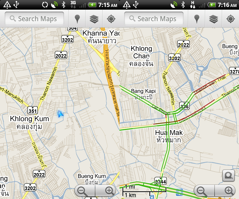 แผนที่ปกติ และ แผนที่พร้อม Google Labs ที่แสดงข้อมูลปริมาณการจราจร