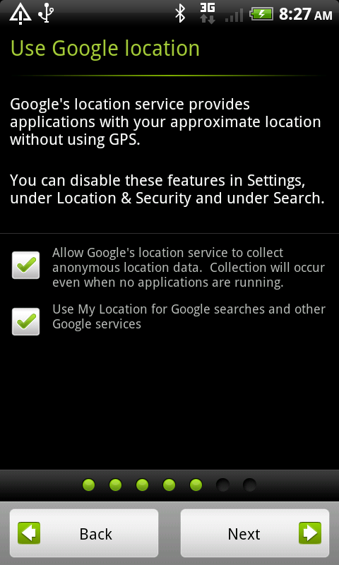 - Location - สำหรับการเข้าไปเปิดใช้งาน A-GPS เพื่อใช้ตำแหน่งจากเครือข่าย การเปิดใช้งาน GPS เพื่อใช้ตำแหน่งจากดาวเทียม เปิดใช้งานระบบค้นหาโทรศัทพ์ เมื่อสูญหายหรือถูกขโมย เพิ่มความสามารถให้ Google Navigation ด้วย HTC Locations และ การปรับคืนตำแหน่งในแอพพลิเคชั่น