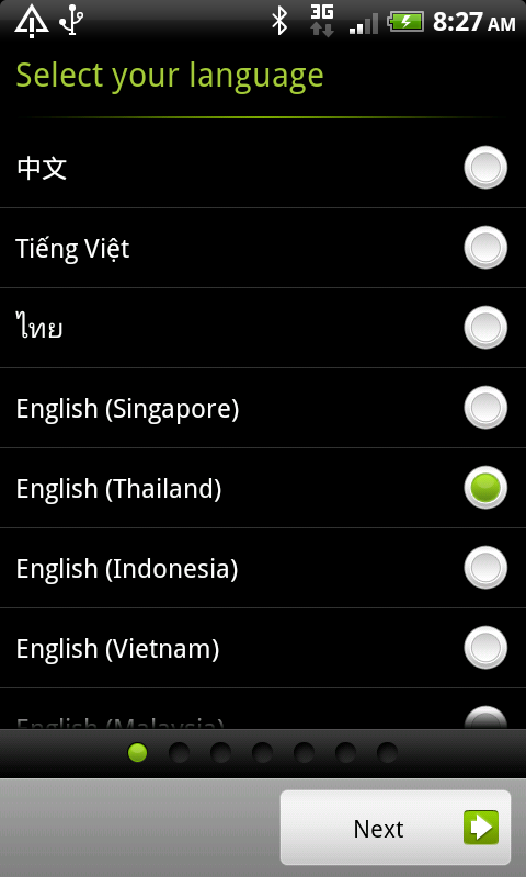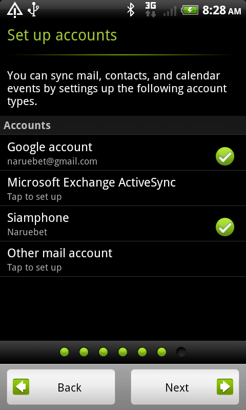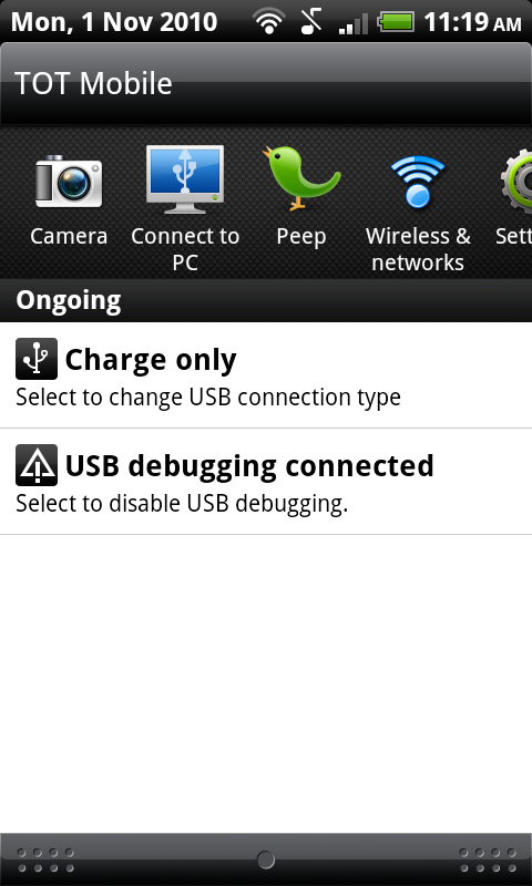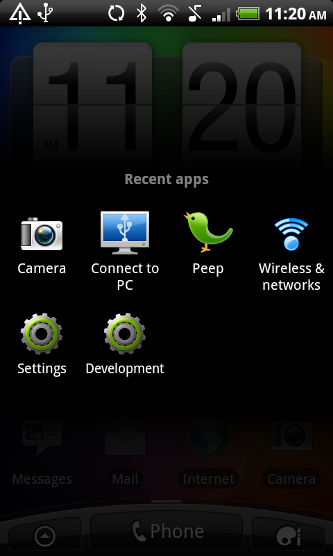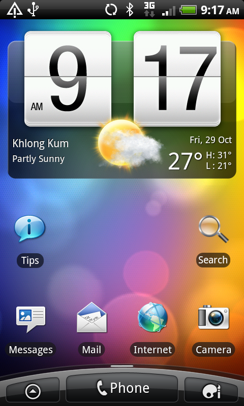 กดปุ่ม Power เพื่อเริ่มงานตัวเครื่อง ใช้นิ้วสัมผัสหน้าจอแล้วลากลงล่าง จะพบกับหน้าจอหลัก หรือ Home screen ของ HTC Sense