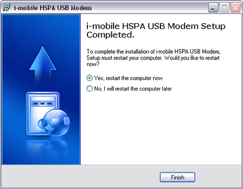 ตามขั้นตอนการติดตั้งไปจนเสร็จสิ้น ระบบจะให้รีสตาร์ทคอมพิวเตอร์หนึ่งครั้ง หลังจากคอมพิวเตอร์ Restart กลับเข้ามาในระบบปฏิบัติการเรียบร้อย บนหน้าจอเดสค์ท็อปจะแสดงไอคอน i-mobile HSPA USB Modem ขึ้นมา เป็นโปรแกรมสำหรับใช้โทรศัพท์มือถือเป็นโมเด็ม ให้ดับเบิ้ลคลิกที่ไอคอนดังกล่าวเพื่อเปิดโปรแกรม รอสักครู่เพื่อให้ระบบค้นหาสัญญาณเครือข่ายโทรศัพท์มือถือ จากนั้นให้คลิกที่รูปไอคอนโลก เพื่อเชื่อมต่ออินเตอร์เน็ต เมื่อทำการเชื่อมต่อเรียบร้อยจะมีหน้าต่างแสดงสถานะการเชื่อมต่อขึ้นมา บอกระยะเวลาในการเชื่อมต่อ และ จำนวนข้อมูล พร้อมปุ่มกดยกเลิกการเชื่อมต่อ