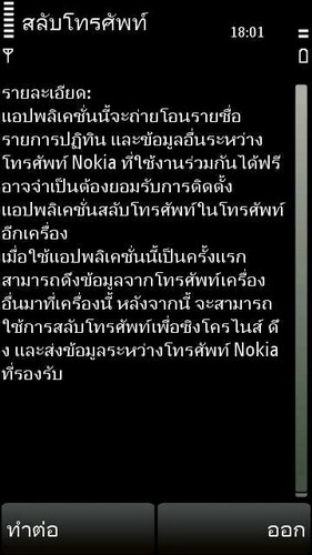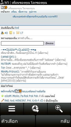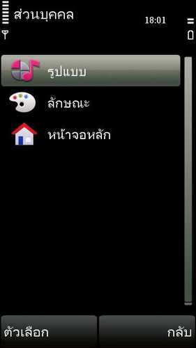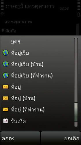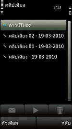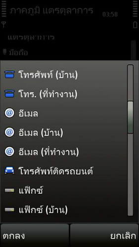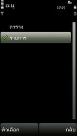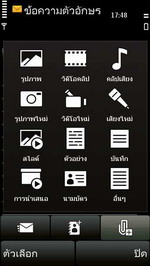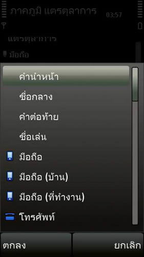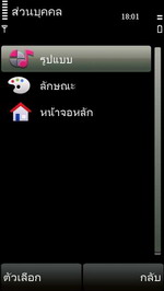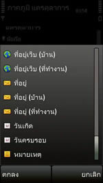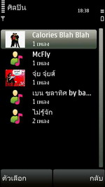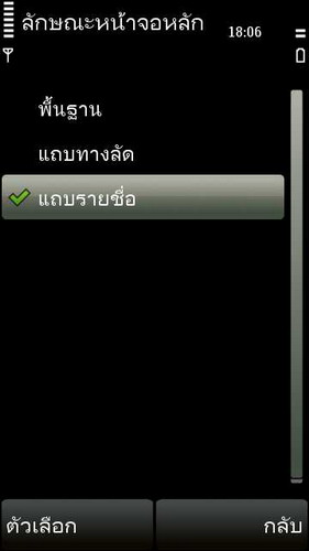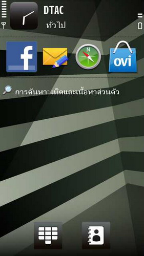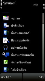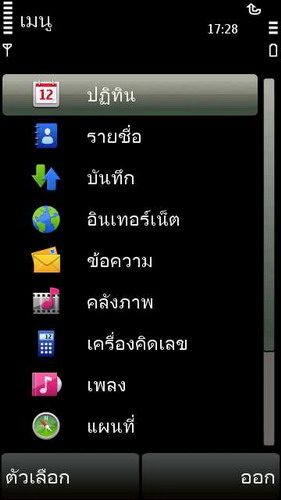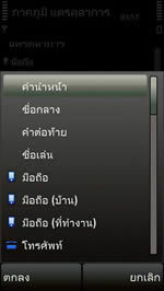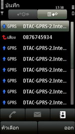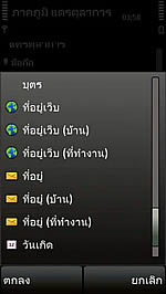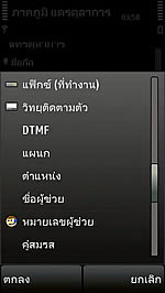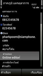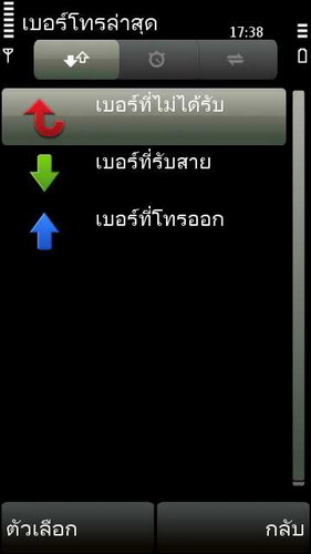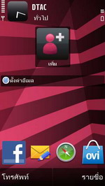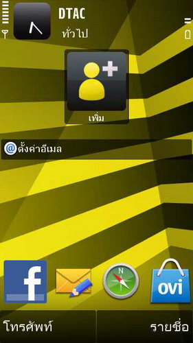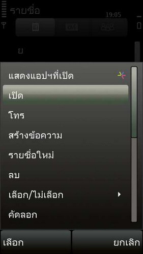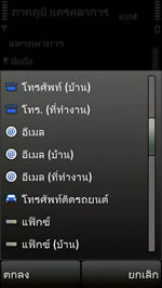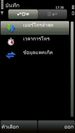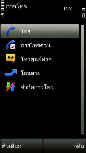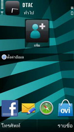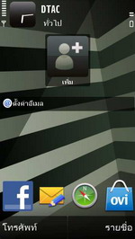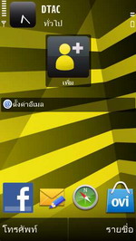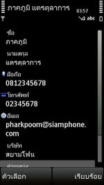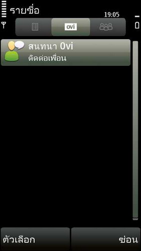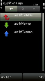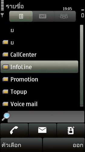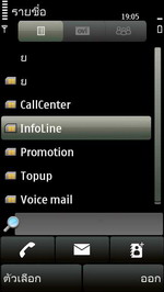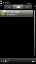 รายชื่อ - แสดงรายชื่อได้ 3 แบบ มีแท็บที่ด้านบนให้เลือก คือแสดงรายชื่อที่บันทึกไว้ในซิมการ์ดหรือตัวเครื่อง, แสดงรายชื่อจาก Ovi และ แสดงตามกลุ่มผู้โทร พร้อมปุ่มทางลัดสำหรับโทรออก, ส่งข้อความ และ เพิ่มข้อความอักษร (รูปภาพ, วิดีโอ, เสียง, รูปภาพใหม่, วิดีโอใหม่, เสียงใหม่, สไลด์, ตัวอย่าง, บันทึก, การนำเสนอ, นามบัตร, อื่นๆ)