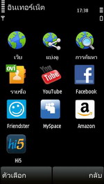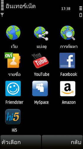 อินเทอร์เน็ต - รวมแอปพลิเคชั่นที่ใช้งานร่วมกับเครือข่ายอินเทอร์เน็ต รองรับเว็บบราวเซอร์, แบ่งดูหรืออัพโหลดเนื้อหา-รูปภาพในบล็อก, การค้นหา, รายชื่อ Ovi, YouTube, Facebook, Friendster, MySpace, Amazon และ Hi5