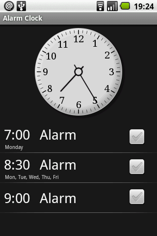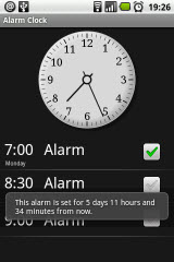 Alarm Clock โปรแกรมสำหรับตั้งเวลาปลุก ผู้ใช้สามารถเพิ่มเงื่อนไขการปลุกได้มากกว่า 3 เงื่อนไข โดยในแต่หละเงื่อนไข สามารถกำหนดได้ว่าจะให้เครื่องปลุกเวลาใหน ใช้เสียงปลุกใด ต้องการให้เครื่องสั่นหรือไม่ ให้ปลุกในวันใหนบ้าง และชื่อของเงื่อนไข