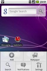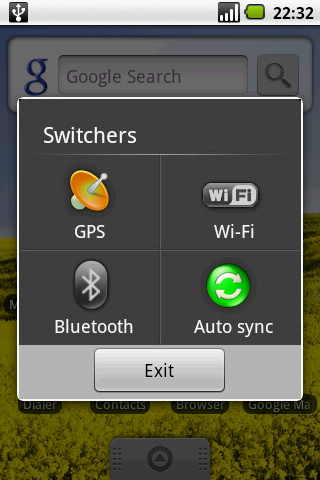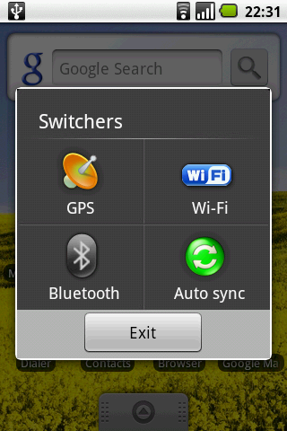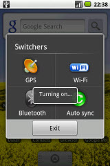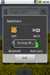 Switchers โปรแกรมสำหรับเปิดปิดสัญญาณไร้สายต่างๆ GPS Wi-Fi Bluetooth และการซิงค์ข้อมูล เป็นทางลัดช่วยให้สะดวกในการใช้งานมือถือเครื่องนี้ยิ่งขึ้น เนื่องจาก สะดวกกว่าการเข้าไปปรับแต่งในโปรแกรม Setting