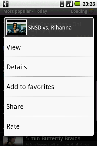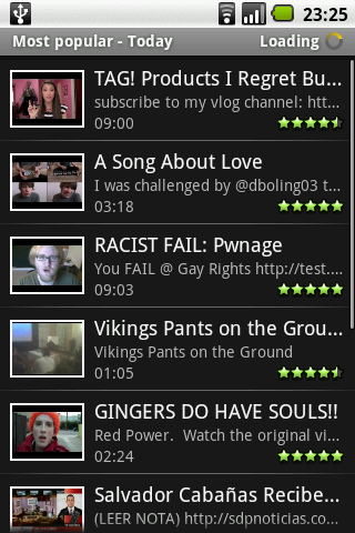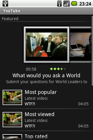 Youtube รับชมคลิปวีดีโอจากเว็บไซต์ youtube.com โดยสามารถเลือกชมได้ตามหมวดต่างๆ หรือจะค้นหาคลิปที่มีคนโพสไว้ก็ได้ และหากผู้ใช้มีบัญชีของ youtube และได้ทำการเชื่อมต่อไว้แล้วก็จะสามารถเรียกดูวีดีโอที่เลือกไว้ในรายการโปรด หรืออัพโหลดวีดีโอที่อยู่ในเครื่องขึ้นไปเก็บไว้บนเว็บก็ได้