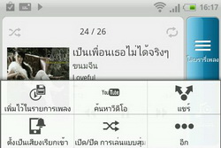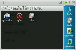 เครื่องเล่นเพลง เมื่อเข้าสู่โปรแกรมเพลง หน้าจอแสดงรูปหน้าปกอัลบั้ม (ถ้ามี), ชื่อเพลง, ศิลปิน, ชื่ออัลบั้ม, แถบเวลา, ปุ่มกดควบคุมเครื่องเ่ล่นเพลง แถบด้านข้างนำไปที่กำลังเล่น และไลบรารี่เพลง จัดแบ่งหมวดหมู่การค้นหาเพลงตามศิลปิน, อัลบั้ม, รายการเพลง, เพลงทั้งหมด, ผู้เรียบเรียง, ผู้ซื้อ และชนิดเพลง มีโหมดการเล่นเพลงแบบสุ่มรายชื่อ, เล่นวนซ้ำ ตั้งเพลงเป็นเสียงเรียกเข้า, แบ่งปันเพลงผ่านทาง Gmail, ข้อความ, บลูทูธ และอีเมล พร้อมเครื่องมือค้นหาวีดีโอใน YouTube จากเพลงที่กำลังรับฟังอยู่
