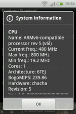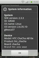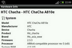 HTC ChaCha ทำงานบนระบบปฏิบัติการแอนดรอยด์ 2.3.3 ใช้หน่วยประมวลผล ARMv6 Processor rev 5 (v6l) - 800 MHz มีหน่วยความจำ 512 MB หน้าจอแสดงผลระบบสัมผัส ความละเอียด 480 x 320 พิกเซล รองรับการใช้งานมัลติทัชสูงสุด 4 จุด