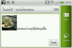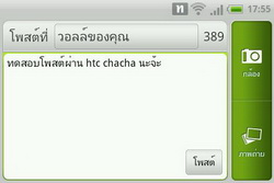 เครือข่ายสังคมออนไลน์ Facebook HTC ChaCha เพิ่มความสะดวกในการเข้าถึงเครือข่ายสังคมออนไลน์ Facebook ด้วยปุ่มทางลัดสำหรับการใช้งาน Facebook โดยเฉพาะ เมื่อกดเข้าไปจะแสดงหน้าโพสต์ข้อความ โดยสามารถเลือกโพสต์ที่กระดานข้อความของผู้ใช้เอง และค้นหารายชื่อเพื่อนๆ เพื่อโพสต์ได้เช่นกัน ด้านขวามีแถบไอคอนกล้องถ่ายรูปสำหรับถ่ายภาพใหม่แล้วอัพโหลดขึ้นทันที หรือเลือกจากภาพถ่ายที่มีอยู่ในอัลบั้ม