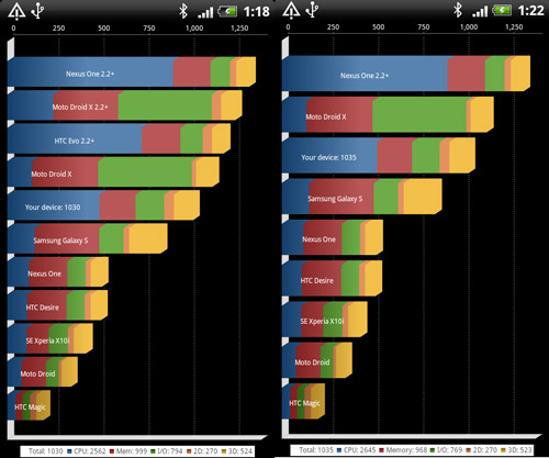 ตัวเครื่องประกอบด้วยหน่วยประมวลผลความเร็ว 1GHz RAM 768MB วัดคะแนนความสามารถโดยใช้โปรแกรม Quadrent ผลที่ได้อยู่ที่ 1030 - 1035 คะแนน