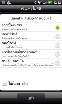 เมื่อเชื่อมต่อตัวเครื่องเข้ากับคอมพิวเตอร์จะปรากฏหน้าจอตัวเลือกการเชื่อมต่อ ผู้ใช้สามารถเลือกใช้งานอินเทอร์เน็ตจากตัวเครื่อง หรือ แบ่งอินเทอร์เน็ตจากคอมพิวเตอร์มาใช้ก็ได้