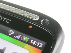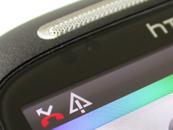 ด้านหน้า มีลำโพงเสียงอยู่ส่วนบน ข้างๆ กันจะมีกล้องหน้า ความละเอียด VGA สำหรับทำกระจกเงา ถ่ายภาพตนเอง และ สนทนาแบบเห็นภาพ (Video Call) ถัดลงมาเป็น เซนเซอร์สำหรับตรวจวัดระยะห่างระหว่างใบหน้ากับตัวเครื่อง เซนเซอร์วัดความสว่างของแสงด้านหน้าตัวเครื่อง และ ไฟแสดงสถานะ เมื่อมีการแจ้งเตือน ข้อความ อีเมล หรือ แบตเตอรี่