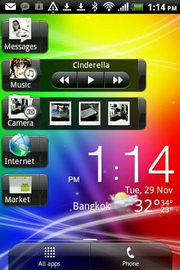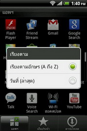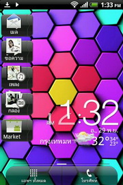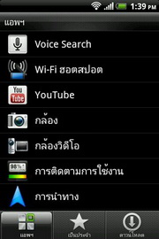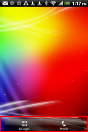 - ด้านล่างสุด มีแถบไอคอนสำหรับเปิดแอพฯ ทั้งหมด และโทรศัพท์ โดยจะแสดงในทุกๆ หน้าของหน้าจอหลักทั้ง 7 หน้า